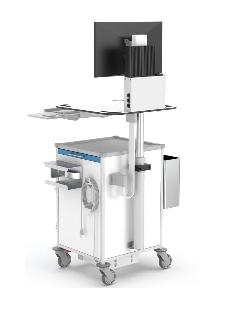 Use the MAX nursing trolley as a modern mobile IT workstation. We offer bespoke power systems for thin clients, laptops and more. Or opt for the Onyx All-in-One computer: a powerful, medically certified (EN-60601) device which integrates computer and monitor in one compact unit – hygienic, disinfectable and perfectly integrated.