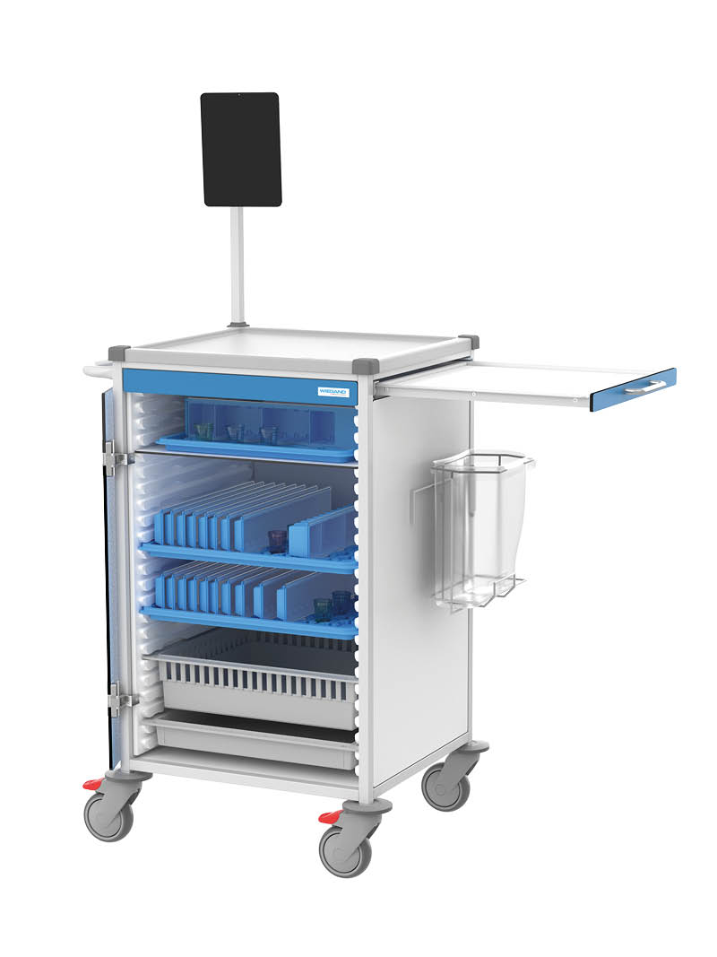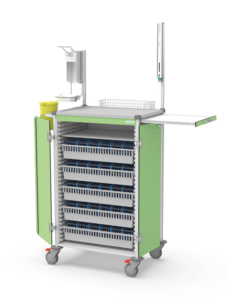 Medication rounds are often accompanied by a range of additional tasks. It is therefore essential to transport medicines and other supplies safely and efficiently. The medication trolley helps reduce walking distances by providing ample space for prepared medications, reserves and any other materials needed throughout the dispensing process.