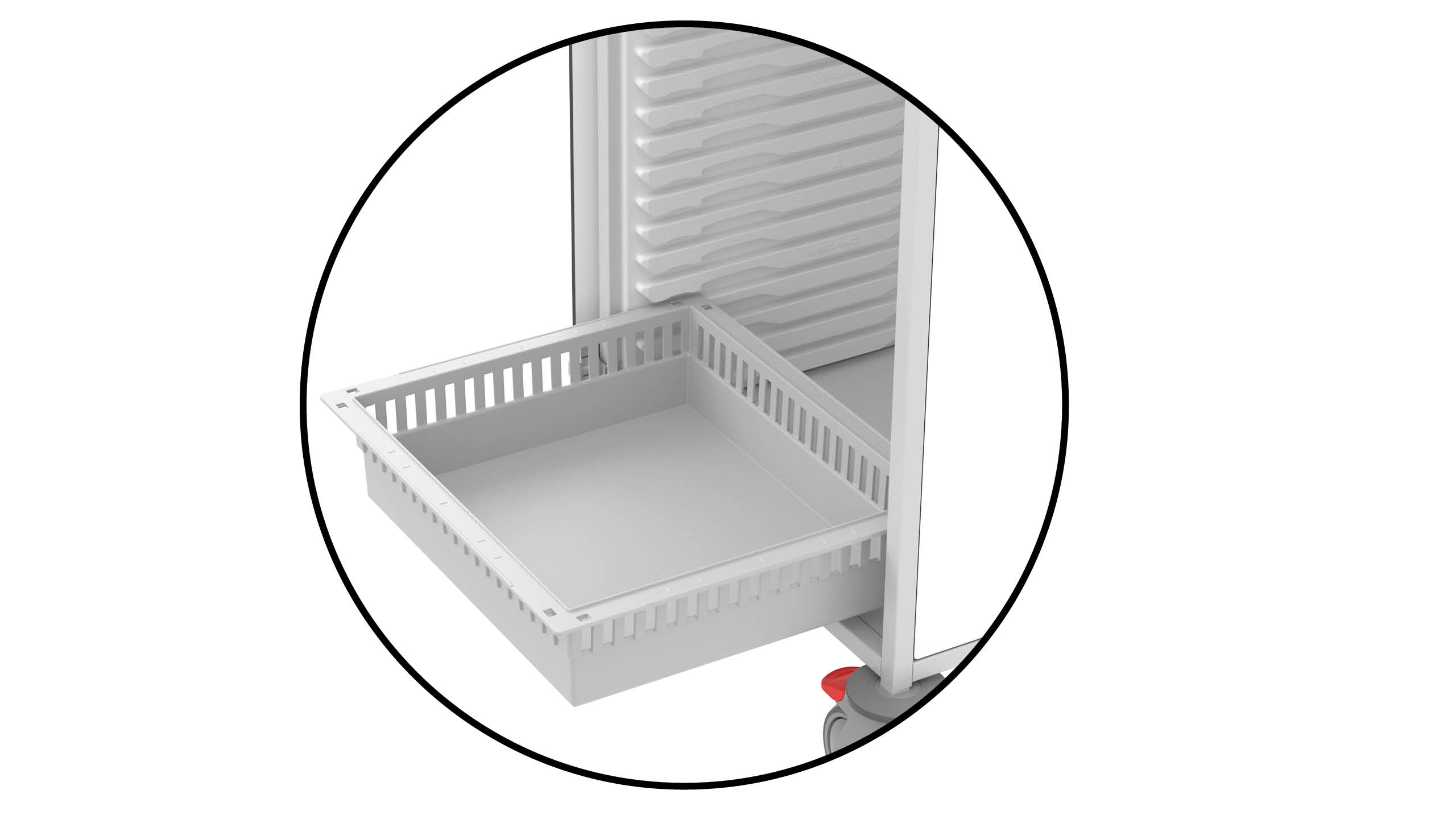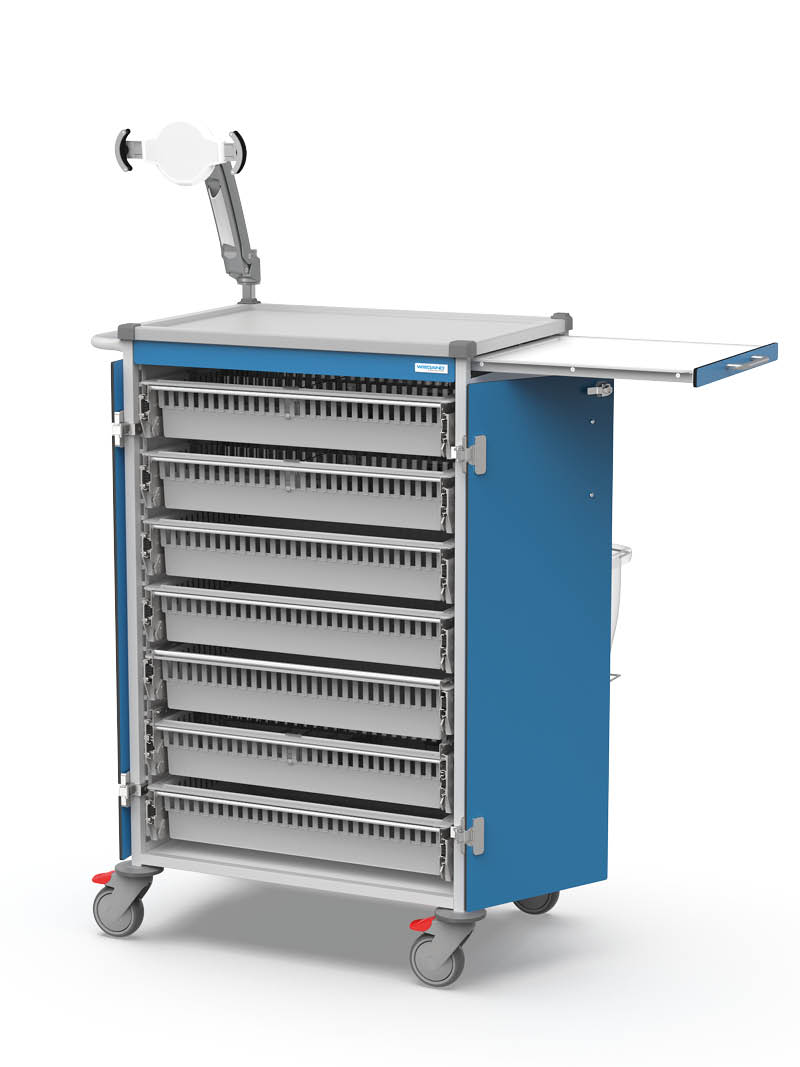 Our well-designed shelving profiles optimise space within the trolley. WIEGAND weekly trays can easily be slotted into the 32 mm grid and transported securely. FlexModule trays and baskets provide additional storage for reserve or emergency medications and other materials, keeping everything organised, hygienic, and within easy reach at all times.