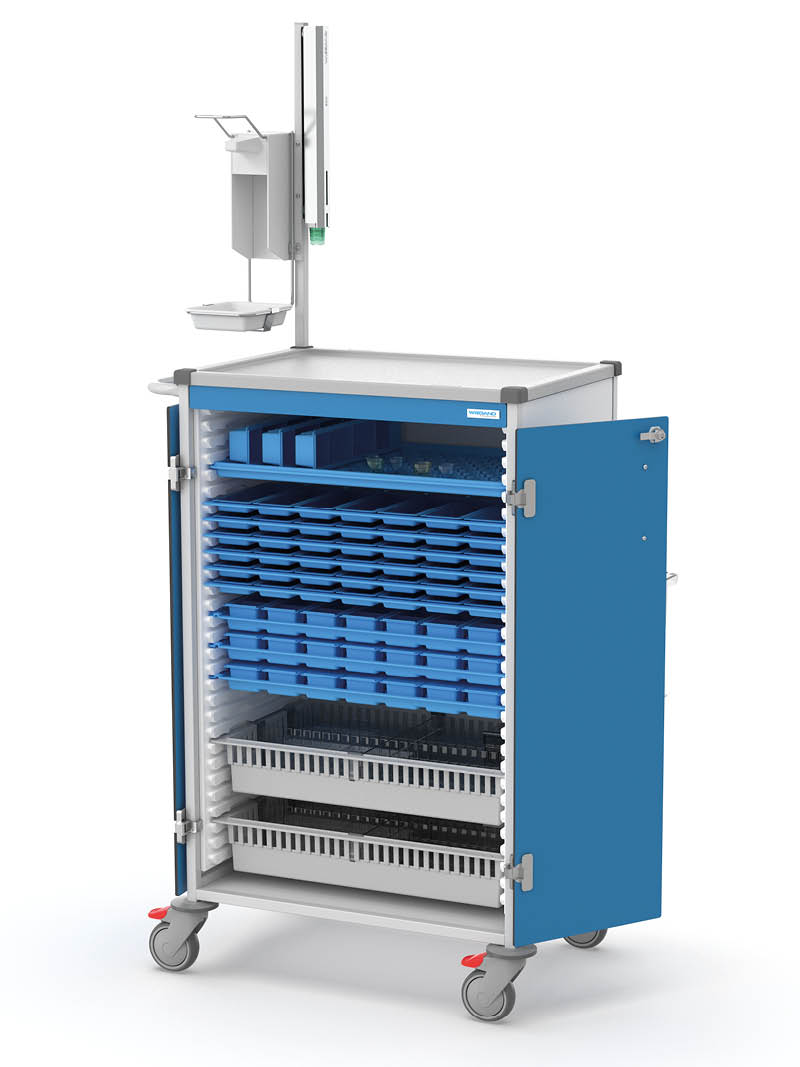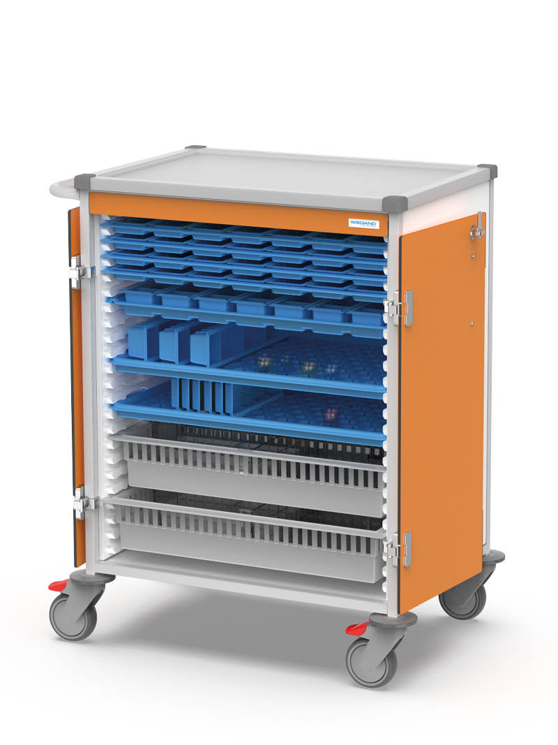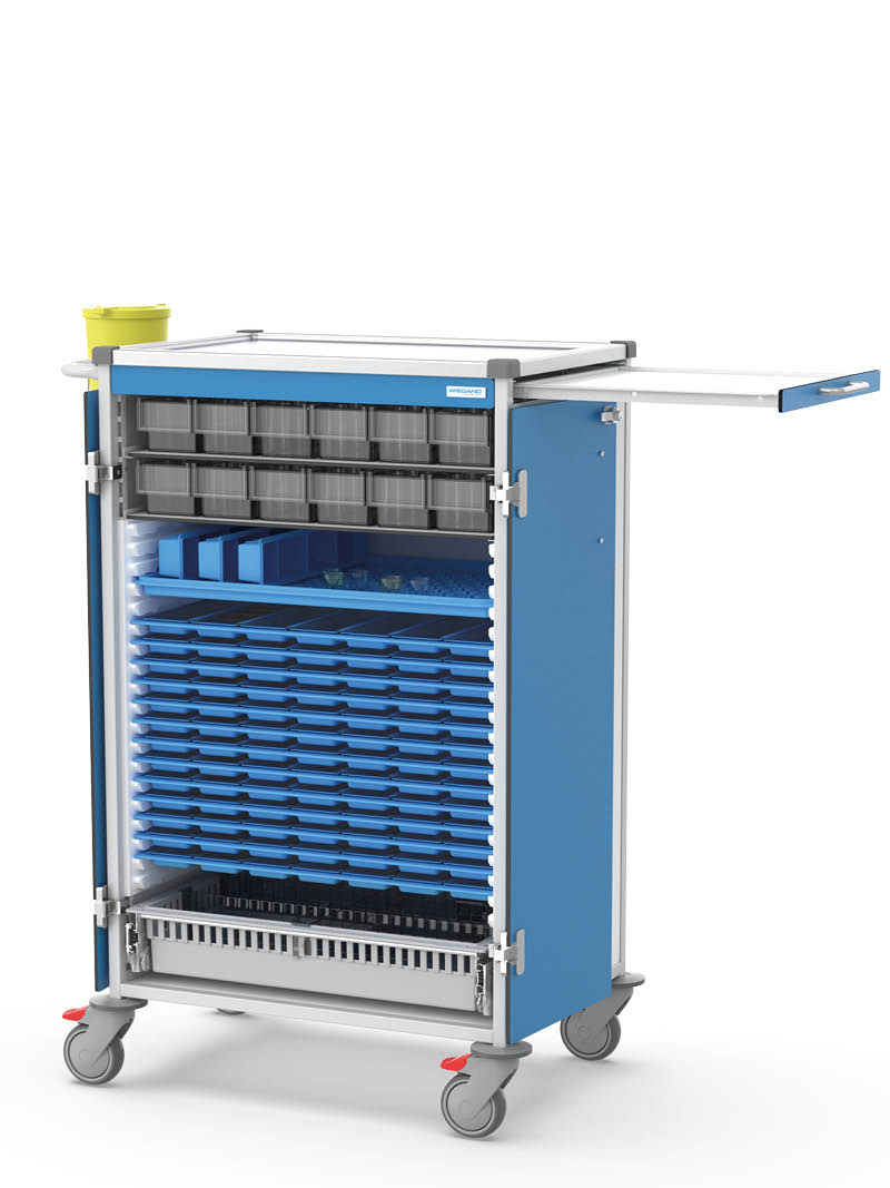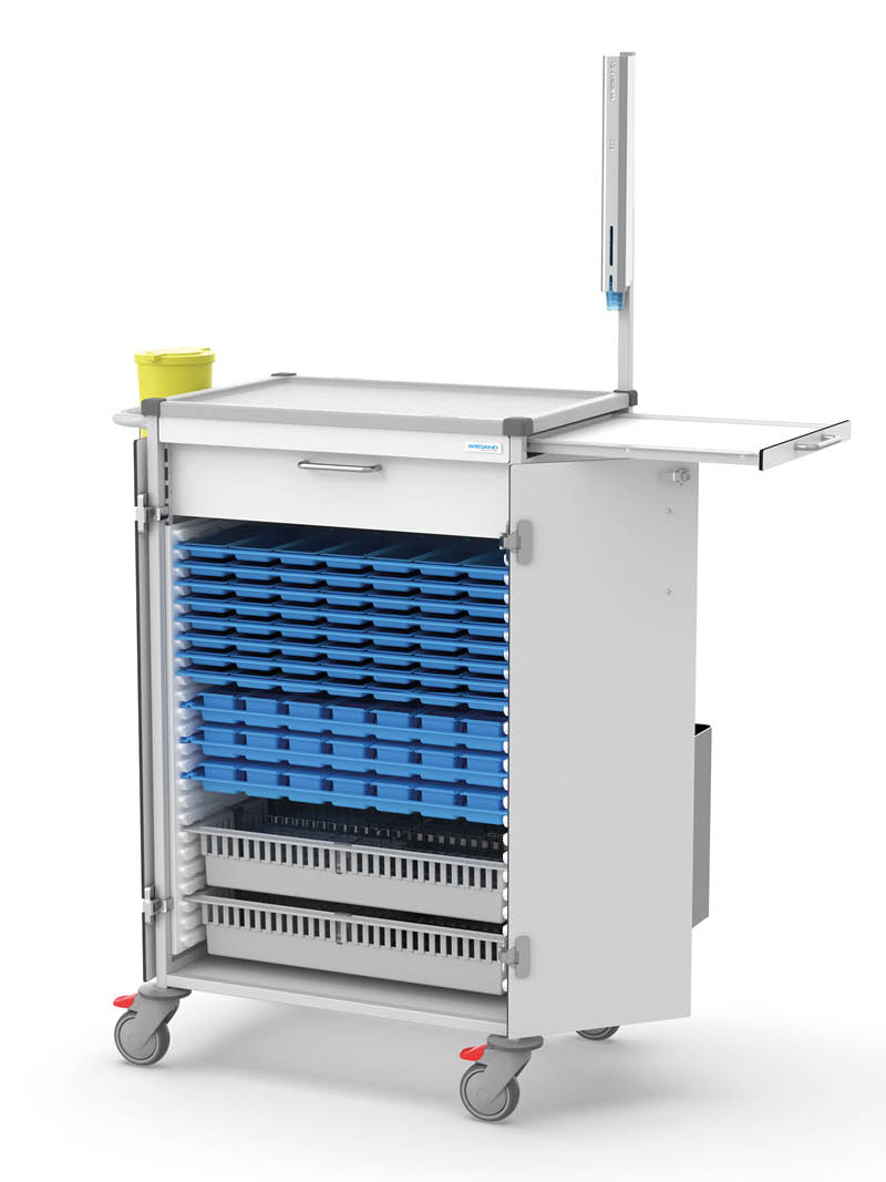 The WIEGAND medication distribution system can be integrated into weekly system trolleys in a compact, efficient and secure manner. Each trolley is tailored to the respective distribution system and to the number of residents or patients. Thanks to their modular design, they can be equipped with a wide range of accessories – ensuring that nursing professionals always have all necessary materials and tools within easy reach.