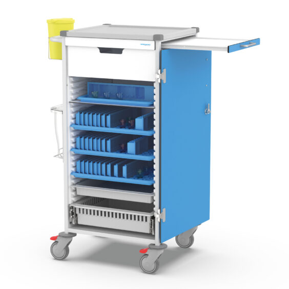 Die Medikationsvergabe wird oft von weiteren Aufgaben begleitet. Deshalb ist es entscheidend, Medikamente und benötigte Hilfsmittel sicher und effizient mitzuführen. Der Medikationswagen unterstützt Sie dabei, Gehwege zu minimieren, indem er ausreichend Platz für vorbereitete Medikamente, Reserven und weiteres Material bietet, das Sie während des Abgabeprozesses benötigen.